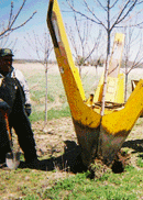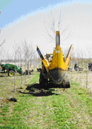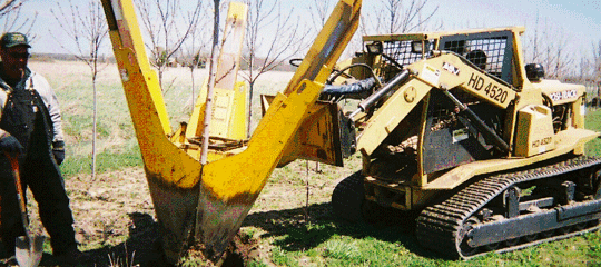 We start with the best and hardiest liners available from the top liner growers in the country. The bare root trees arrive into our warehouse in early March, where they are kept protected and moist. Planting begins in late March and is finished in early April when there is good soil moisture and soil temperatures allow the trees to leaf out slowly. Trees are planted 6' on center in alternating rows to allow enough room to grow and harvest. Holes are machine drilled to allow enough room for root structure, and properly backfilled for minimal settlement and proper trunk flare height. All liner stock is dipped in BioPlex’s Bareroot Root Inoculant prior to planting.